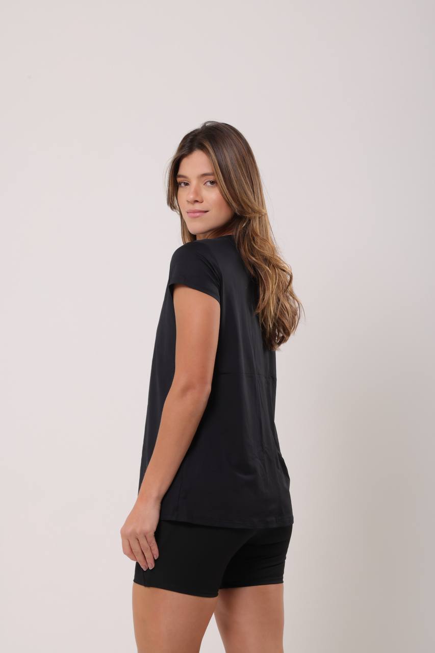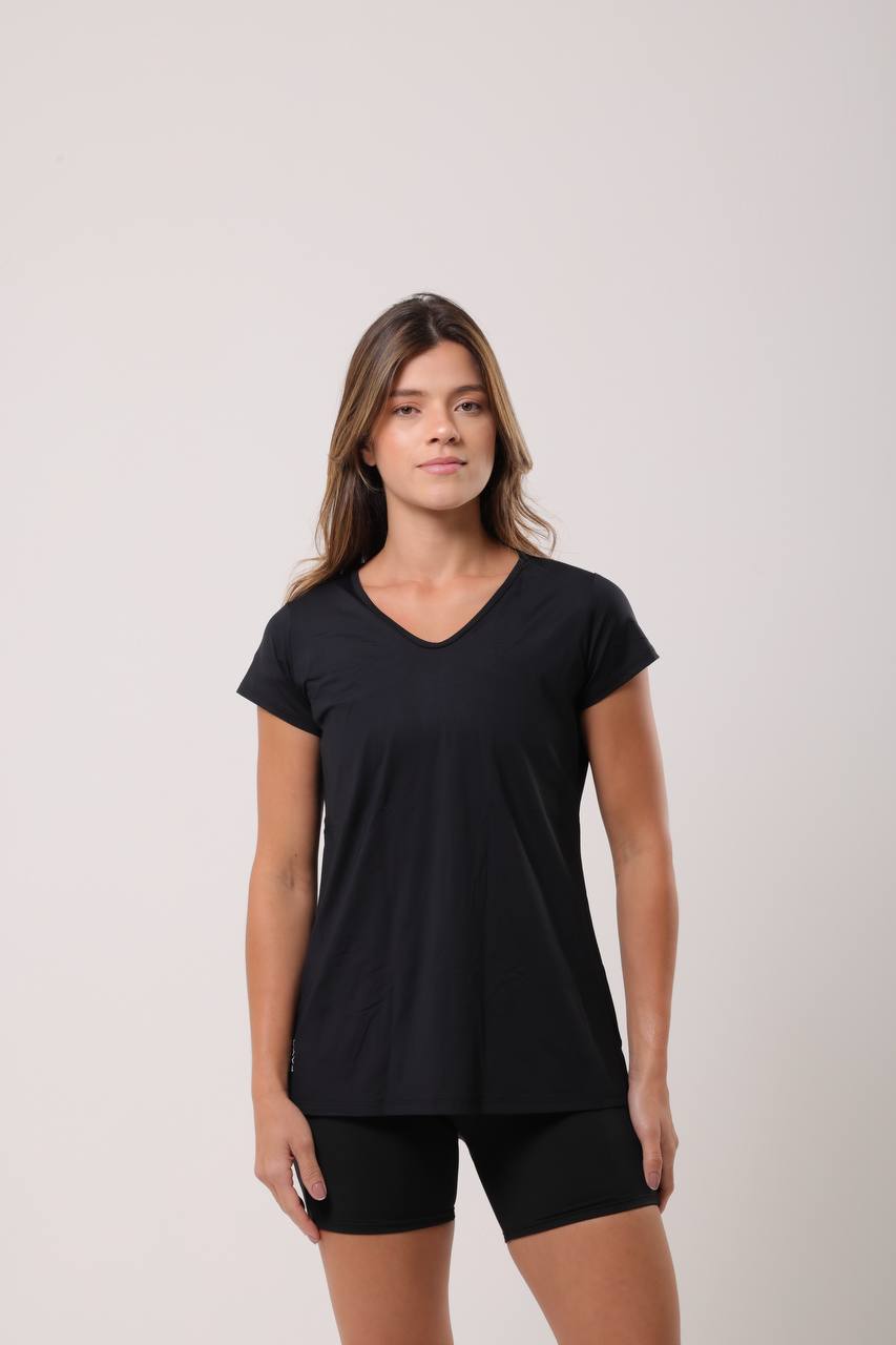 Blusa com decote em V e comprimento ideal para tapar o bumbum, proporcionando mais segurança e liberdade de movimentos. Estilo versátil, para treinos ou looks casuais.